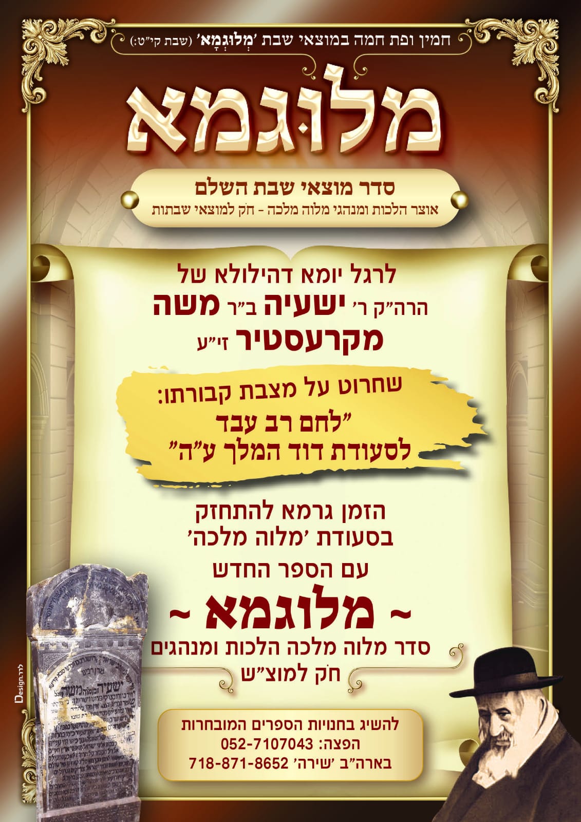 בכל מוצאי שבת, אנו מזמינים אתכם להצטרף למסורת קבועה ומאירה. במסגרת זו נגיש סדר לימוד מיוחד למלווה מלכא מתוך ספר "מלוגמא", לימוד שיפתח לכם את השבוע קצת יותר רוחני ולבטח ישפיע רק טוב על נשמתכם.